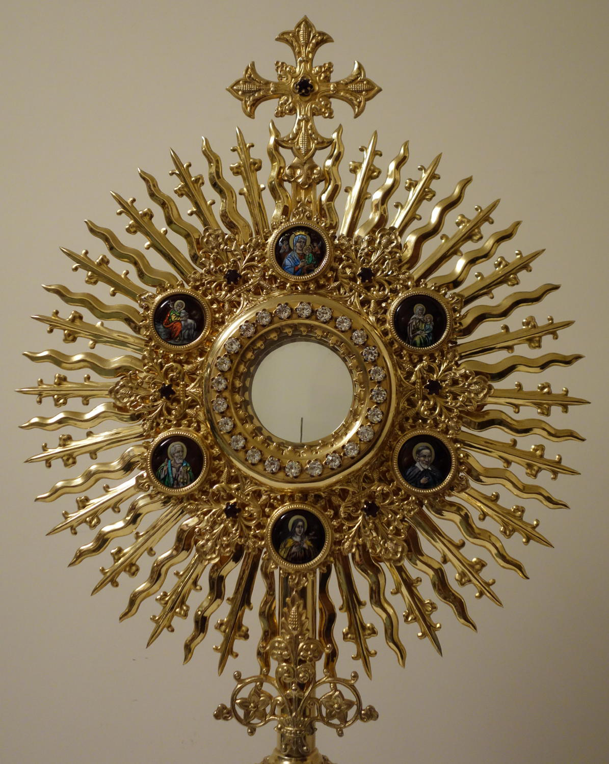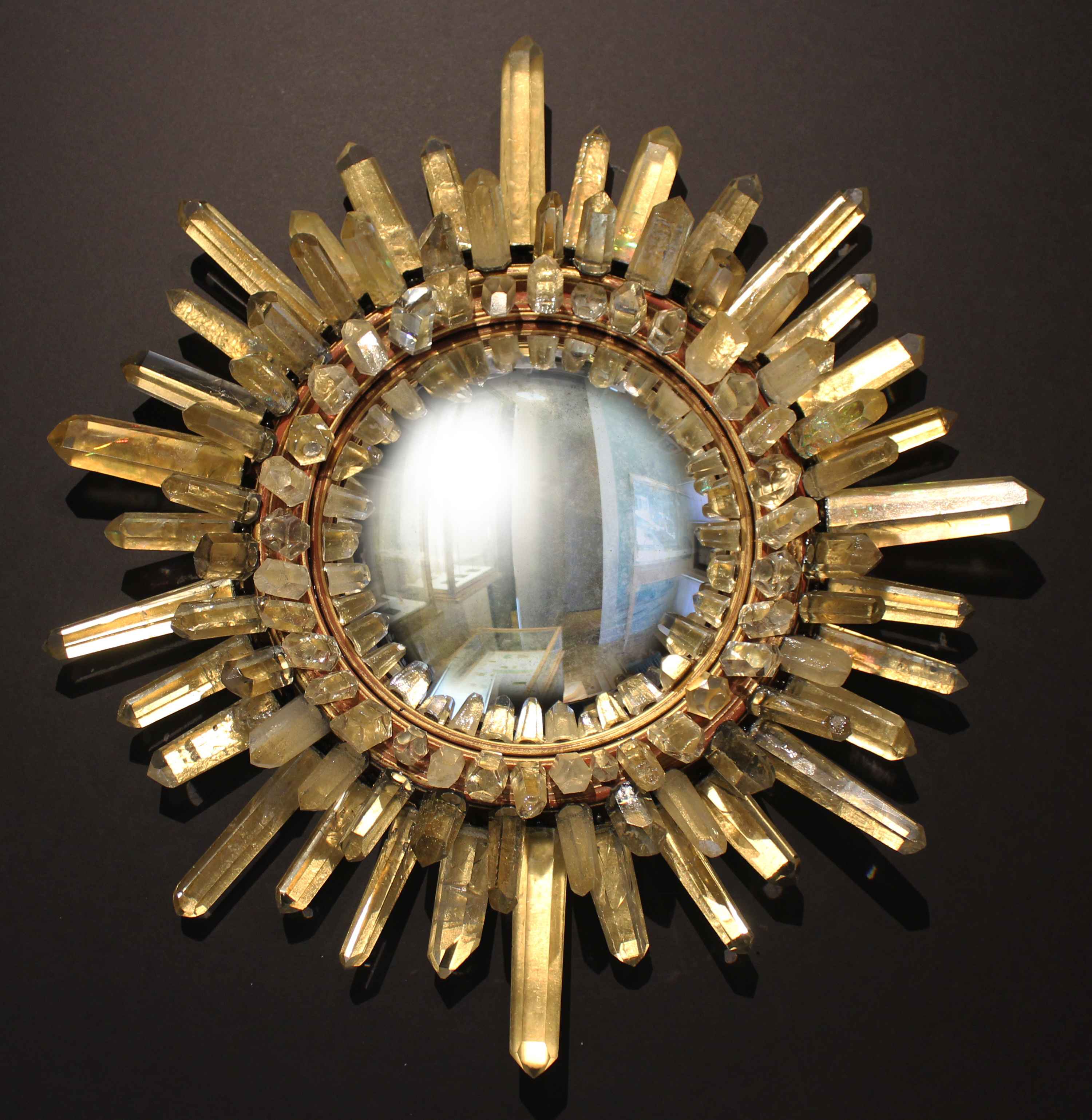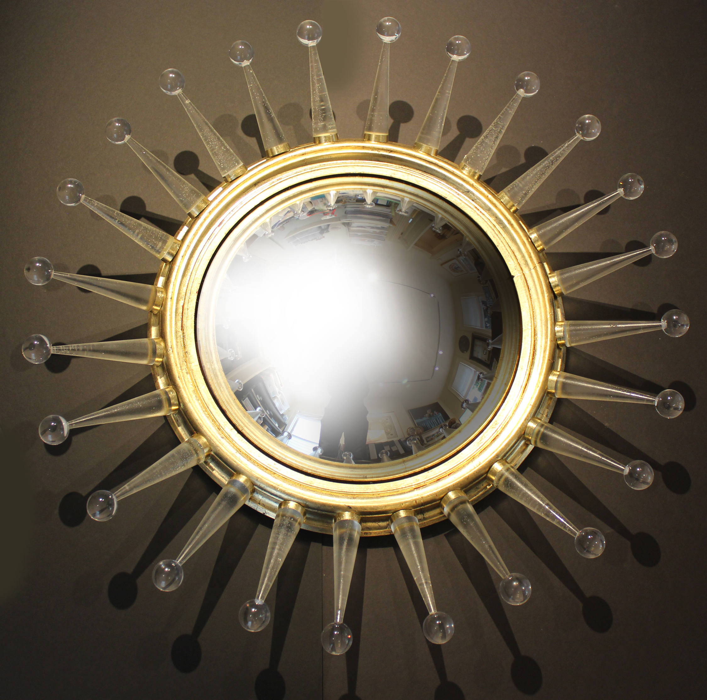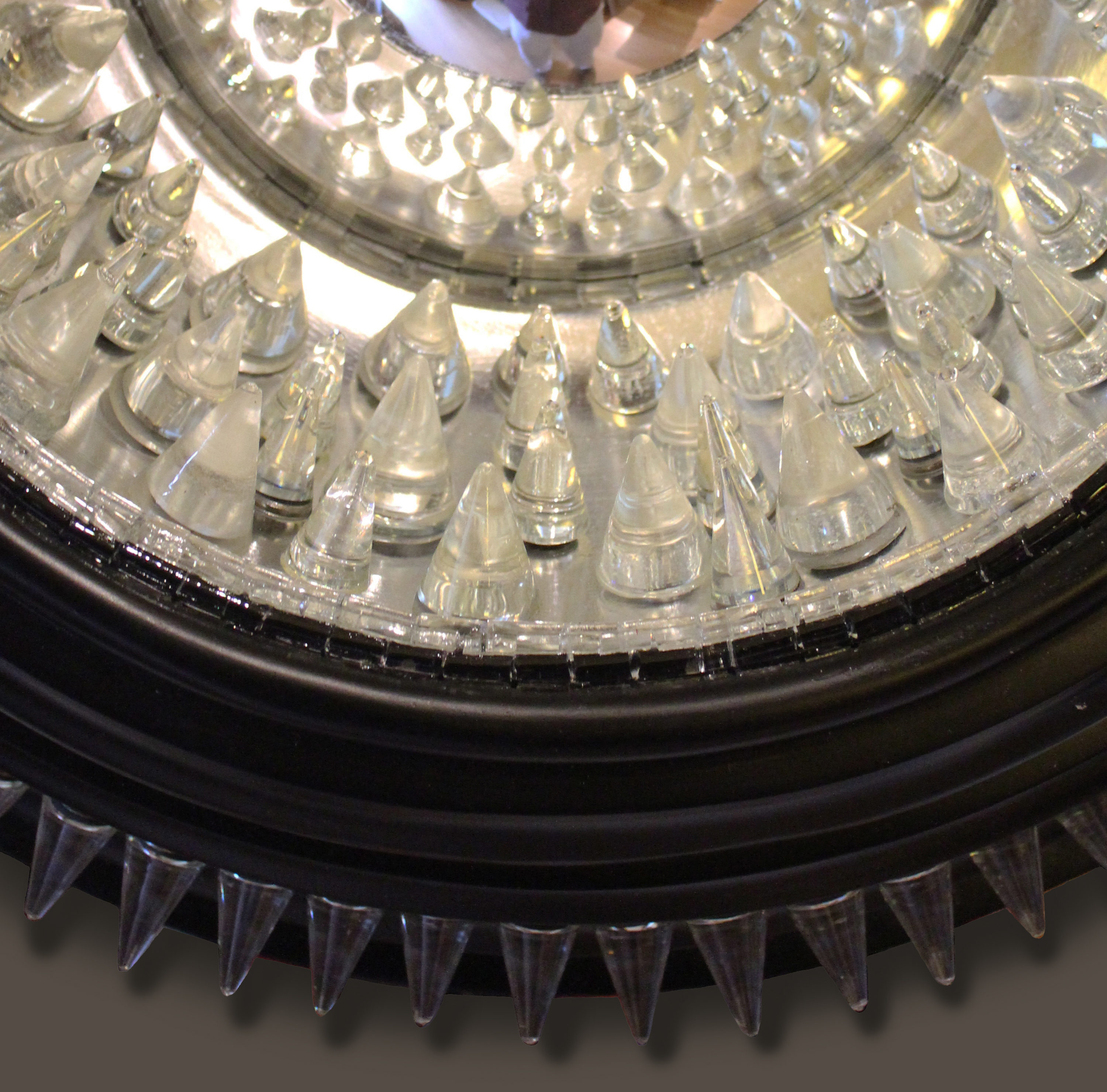 I refinished the frame and gilded it. I then made a silicone mold from cone shaped carved soapstone and made the spikes that flare out from the frame. Each is topped with an acrylic sphere.