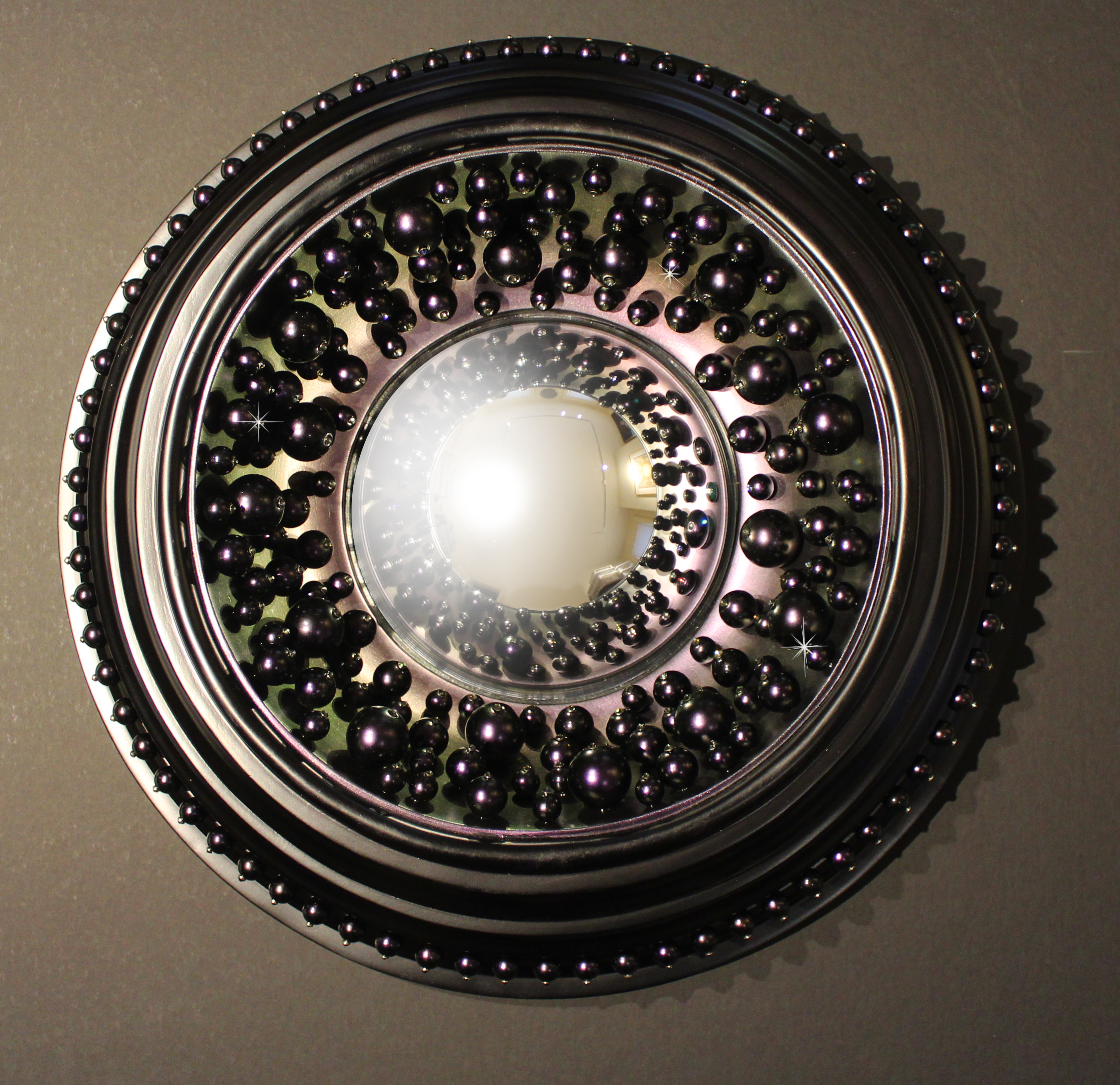 This is a convex mirror created from an old funky round frame I found at a Paris flea market. It sat around for years before I could figure out where to take it.