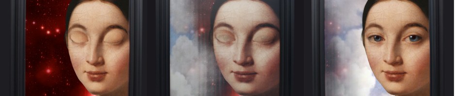 This is a lenticular piece( one image morphs into another depending on the angle that the viewer is looking at the piece) called Day and Night. The original painting is by Ingres in 1806. It is a portrait of Mlle Caroline Riviére who died just two years after the painting was exhibited. Day and Night measures 24″ by 18″