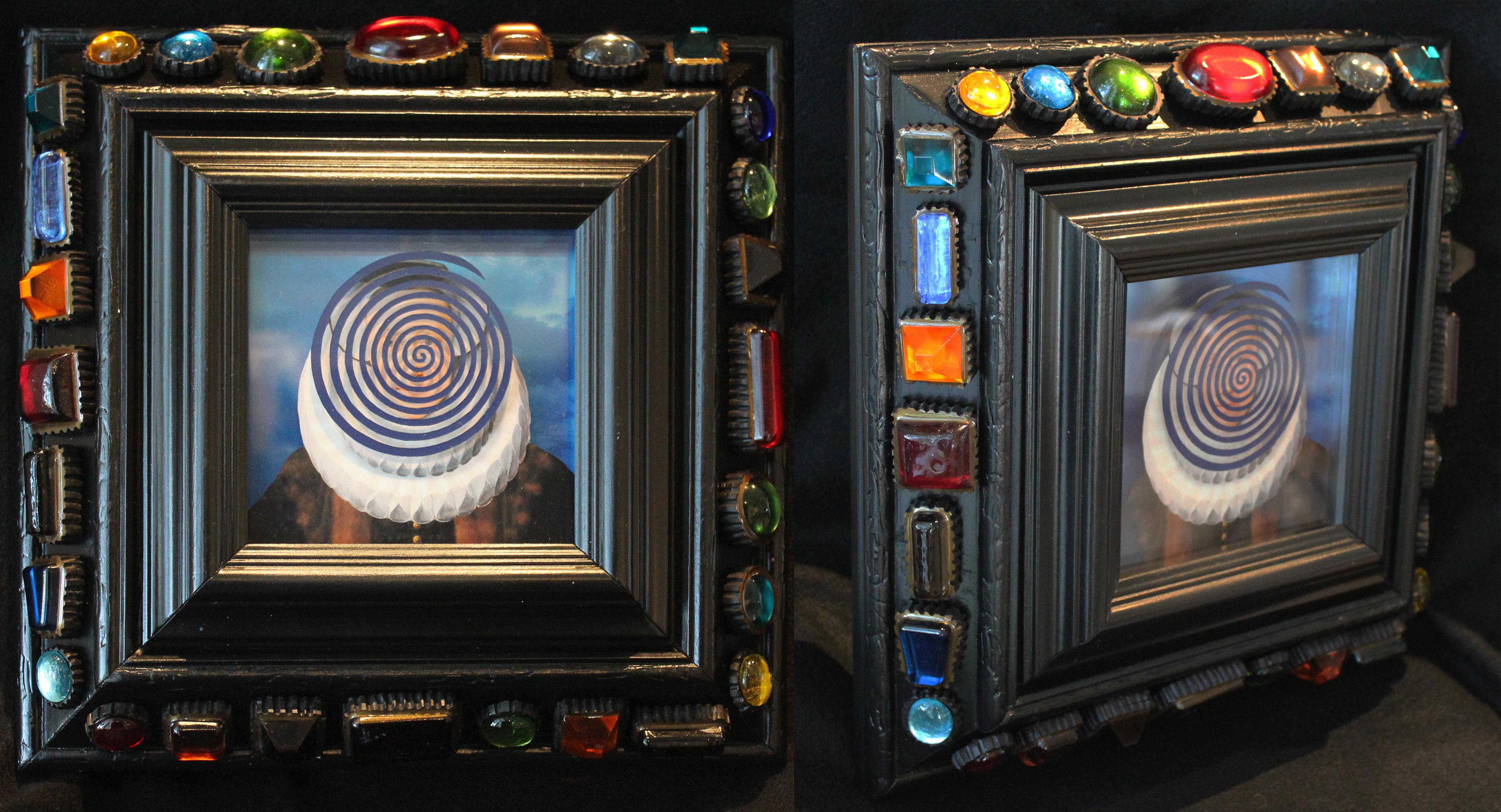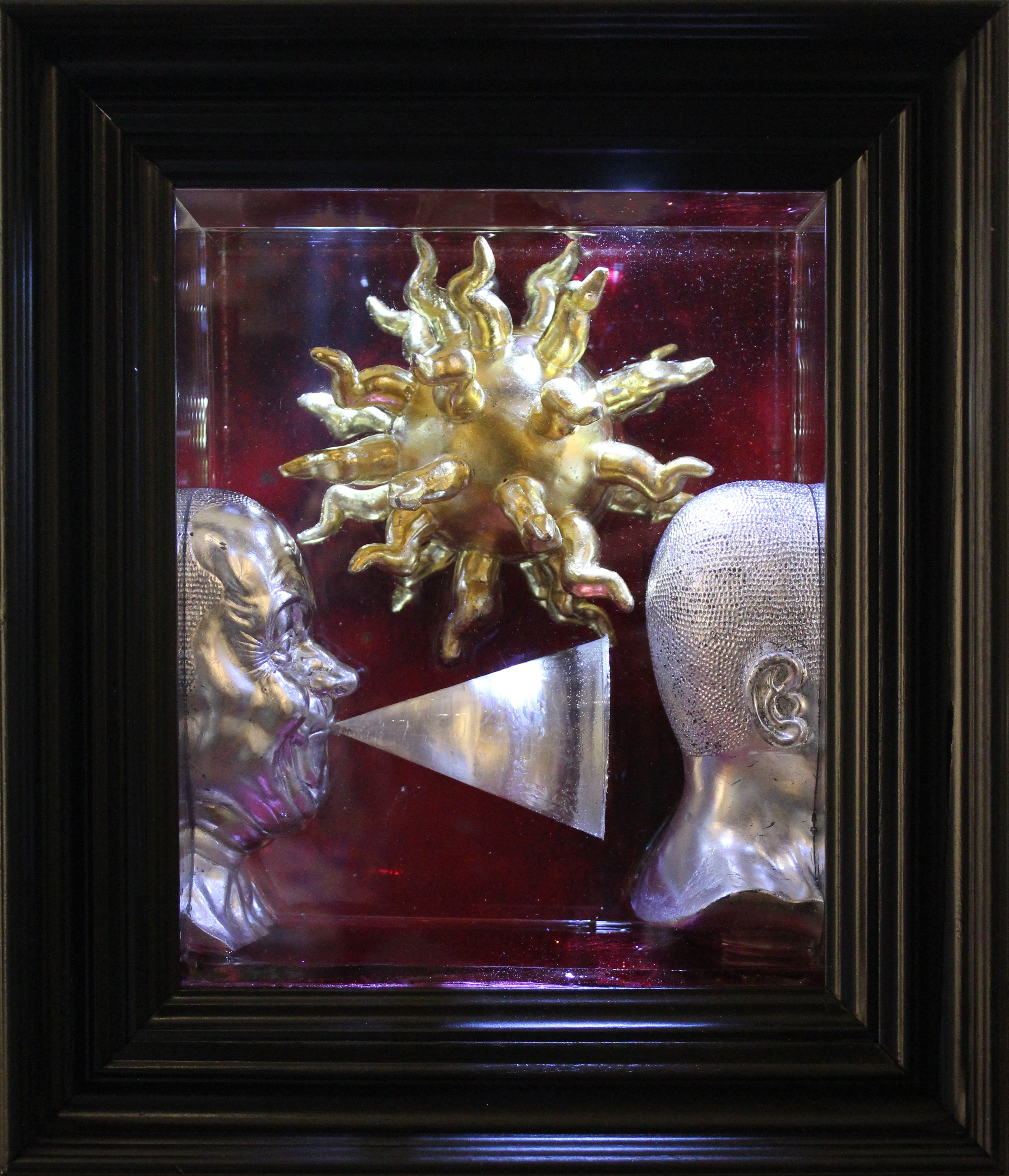 Babel is part of my resin box series. Its a very deep box incorporating one of Franz Xaver Messerschmidt’s “character head” busts. I sliced the bust in half and gilded it with silver. The box is mirrored and the sun sculpture is suspended in clear resin. “Babel” refers to the biblical tale of the hubris and arrogance of man and the subsequent splintering of one language into many. Communication came to a halt and chaos reigned.