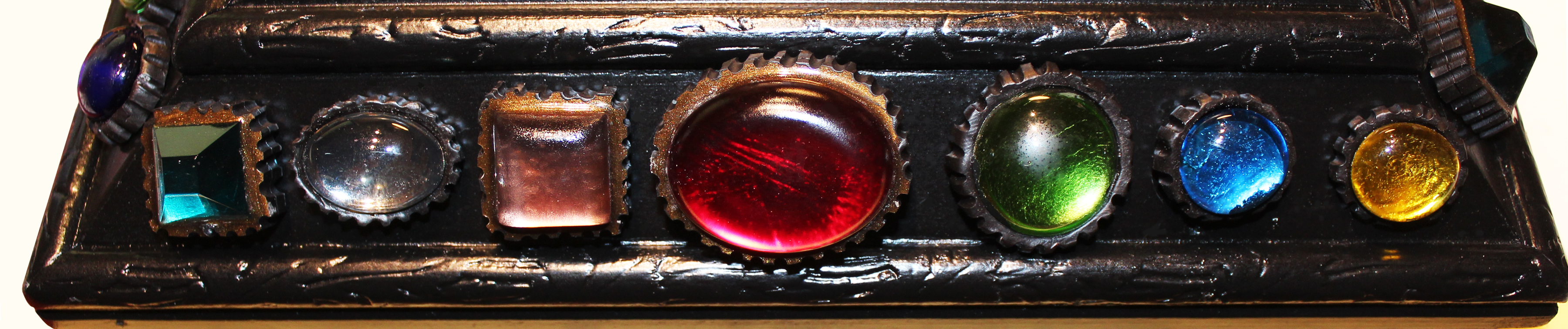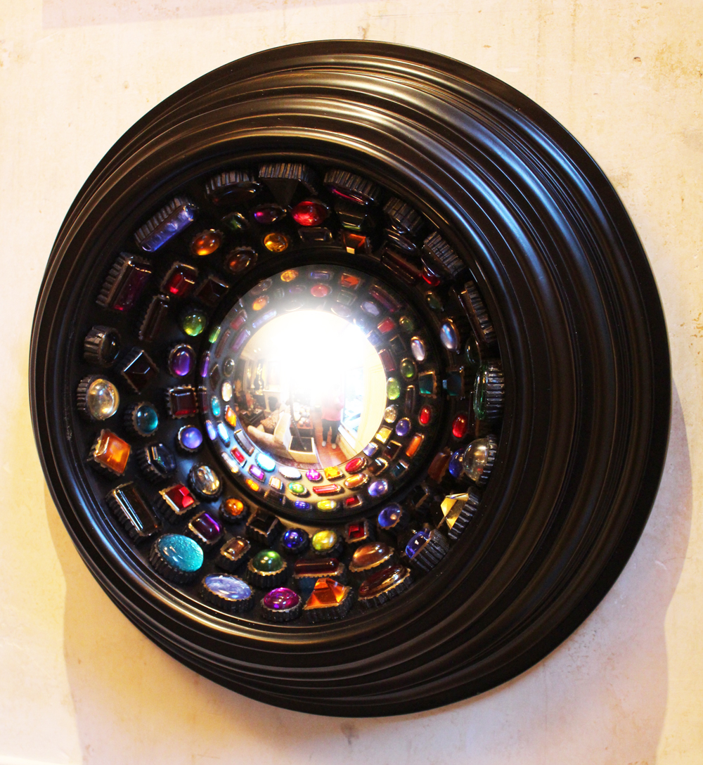 My new convex mirror inspired by the Medici treasures at the Argenti Museum in Florence. Each jewel is hand cast by me and mounted in a fluted setting. Its 18 inches across.